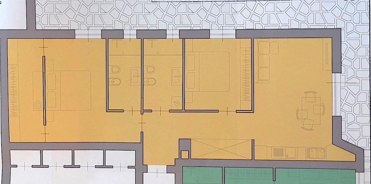 Appartamento di nuova ristrutturazione al piano terra. Composto da ingresso su funzionale disimpegno, ampio soggiorno con zona cottura, giardino su due lati ad angolo, camera da letto padronale con cabina armadi e bagno, seconda camera da letto e bagno.
